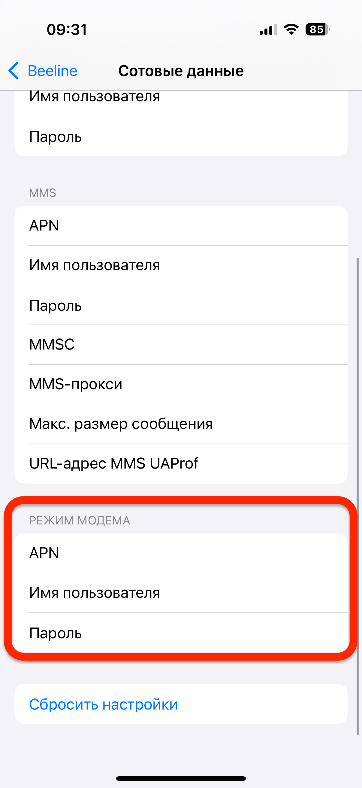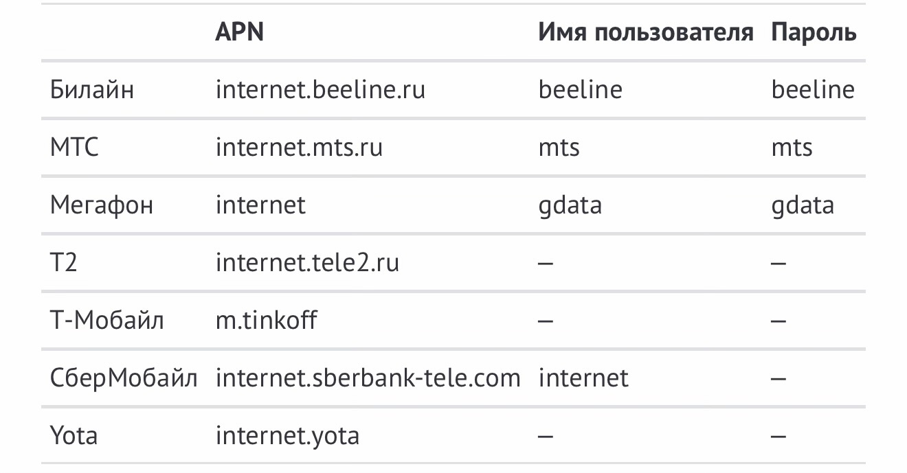 Вот данные для настройки «Режима модема» от популярных российских операторов: